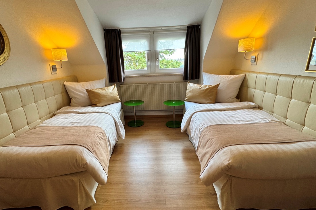 Onze twee Twin Rooms op de tweede verdieping zijn ideaal voor vrienden of familie die liever gescheiden slapen. Ze hebben twee aparte boxspringbedden (90x200 cm elk), een bureau, een zithoek, een kledingkast en een eigen badkamer met douche en toilet. Deze kamers zijn nog niet gerenoveerd, maar bieden alsnog een comfortabele basis.